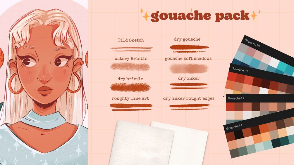 The Digital Gouache Pack is a collection of brushes for lovers of textured brushes. With this set, I want to cover all the needs that an artist will need to create a portrait or illustration with the digital gouache technique, so in this pack, you will find dry brushes, an inker and soft brushes to create this effect. Also included in the set are some extras like 4 colour palettes and a couple of watercolour textures to add some of the paper texture and realism to your digital gouache painting. (*I recommend using the "divide" blending mode for best results)
